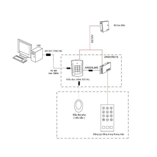 - Sử dụng bộ điều khiển AR401RO16 của SOYAL quản lý 16 tầng lắp đặt bên trong cabin thang máy( mỗi bộ quản lý tối đa 16 tầng, trên 16 tầng cần thêm bộ điều khiển).
