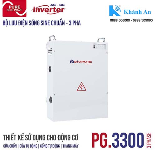 - Cách lắp đặt Bộ lưu điện DoorMatic dùng cho motor cửa cổng tự động 380 Vac sóng SINE CHUẨN, 3 pha PG.3300-3 PHASE rất đơn giản, có tài liệu hướng dẫn đi kèm, đồng thời khi mua hàng tại Khánh An , nếu bạn hàng có yêu cầu thì bộ phận kỹ thuật sẽ cài đặt sẵn mọi thứ, bạn hàng về chỉ cần làm theo hướng dẫn là có thể sử dụng được và Khánh An sẽ hỗ trợ từ xa hoàn chỉnh và sử dụng thành thạo.