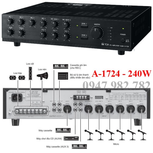• đại lý phân phối lắp đặt Amply Toa A-1724, 240W, chọn 2 vùng loa giá rẻ 0987 982 782