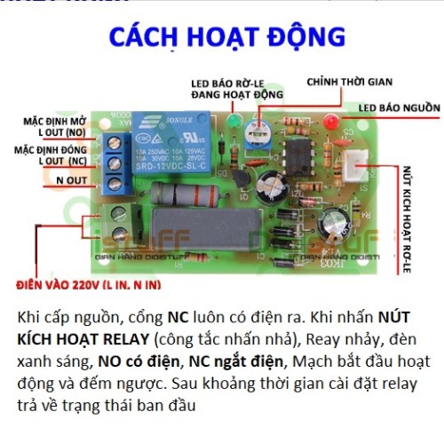 Khi cấp nguồn, cổng NC luôn có điện ta. Khi nhấn NÚT KÍCH HOẠT RELAY (công tắc nhấn nhả), Reay nhảy, đèn xanh sáng, NO có điện, NC ngắt điện, Mạch bắt đầu hoạt động và đếm ngược. Sau khoảng thời gian cài đặt relay trả về trạng thái ban đầu