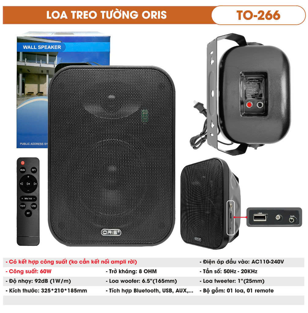 • Mua Loa Treo Tường Tích Hợp Công Suất chính hãng Oris TO 266, công suất 60W, Chuyên Dụng Cho Quán Cafe, Nhà Hàng, Salon Tóc, Viện Thẩm Mỹ, Lớp học, TO-266 giá rẻ, chính hãng ORIS, bảo hành chính hãng, Đầy đủ phụ kiện đi kèm, tài liệu HDSD. Giao hàng COD thu tiền tận nơi, bán giá luôn rẻ và ưu đãi bạn hàng cũ, đại lý, kỹ thuật và mua số lượng.